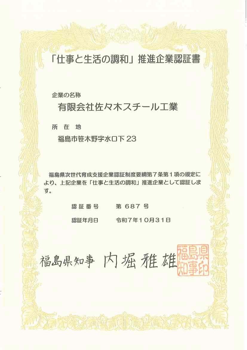 「次世代企業認証 仕事と生活の調和」とは? ・仕事とプライベートを両立出来るよう支援し、誰もが働きやすい環境を整備している企業として認めますという制度。 ノー残業に極力努め、家族 や プライベートなどの時間を大切にと働きかけています!