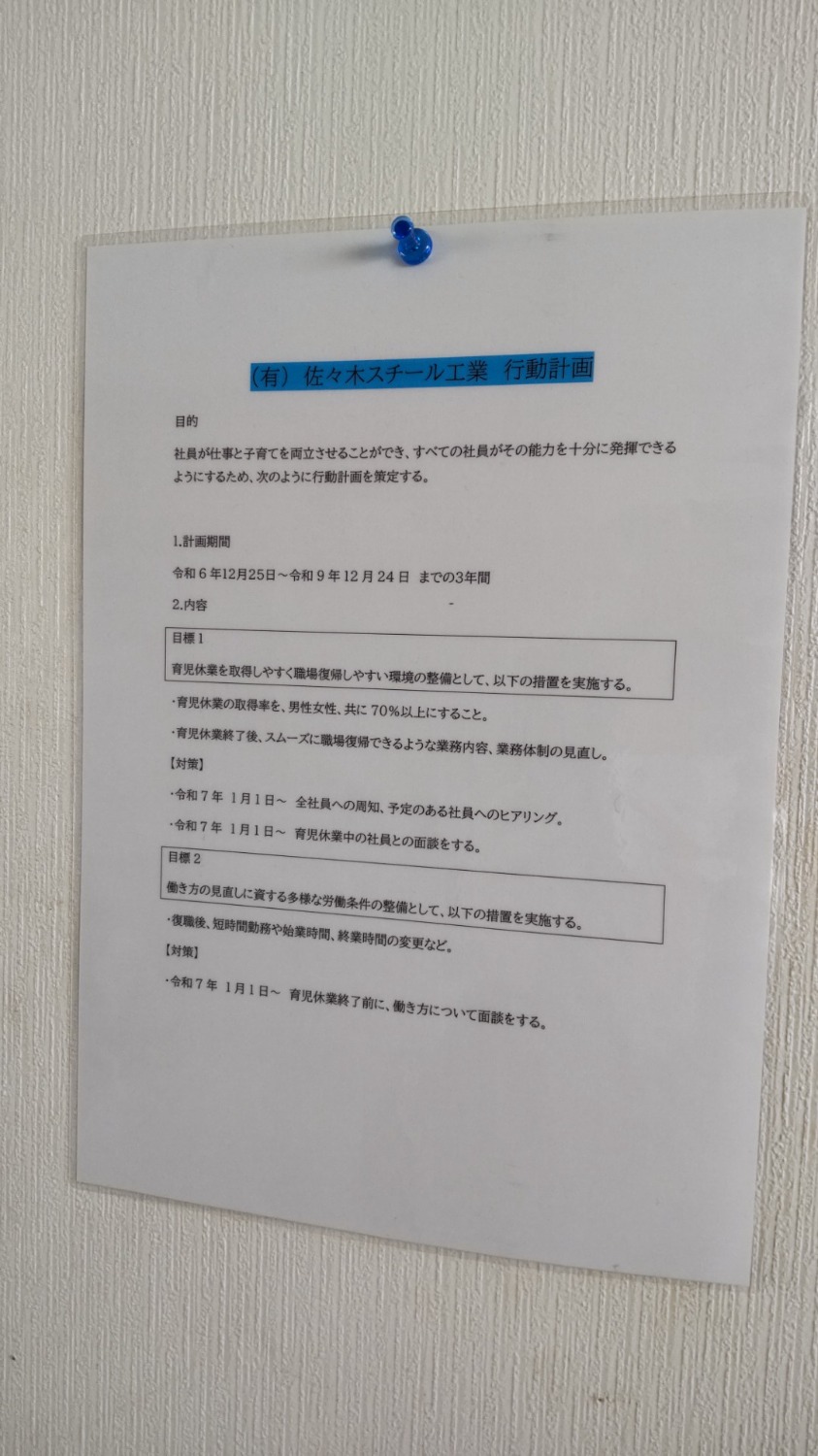 当社では、次世代育成支援対策推進法に基づき、仕事と育児の両立を図るための環境整備に取り組んでいます。 以下、行動計画条文 計画期間 令和6年12月25日~令和9年12月24日 目標① 育児休業を取得しやすく職場復帰しやすい環境の整備として、以下の措置を実行する ・育児休業の取得率を、男女共70%以上にすること ・育児休業終了後、スムーズに職場復帰できるような業務内容、業務体制の見直し 【対策】 ・令和7年1月1日~ 全社員への周知、予定のある社員へのヒアリング ・令和7年1月1日~ 育児休業中の社員との面談をする 目標② 働き方の見直しに資する多様な労働条件の整備として、以下の措置を実施する ・復職後、短時間勤務や始業時間、終業時間の変更など 【対策】 ・令和7年1月1日~ 育児休業終了前に、働き方について面談をする
